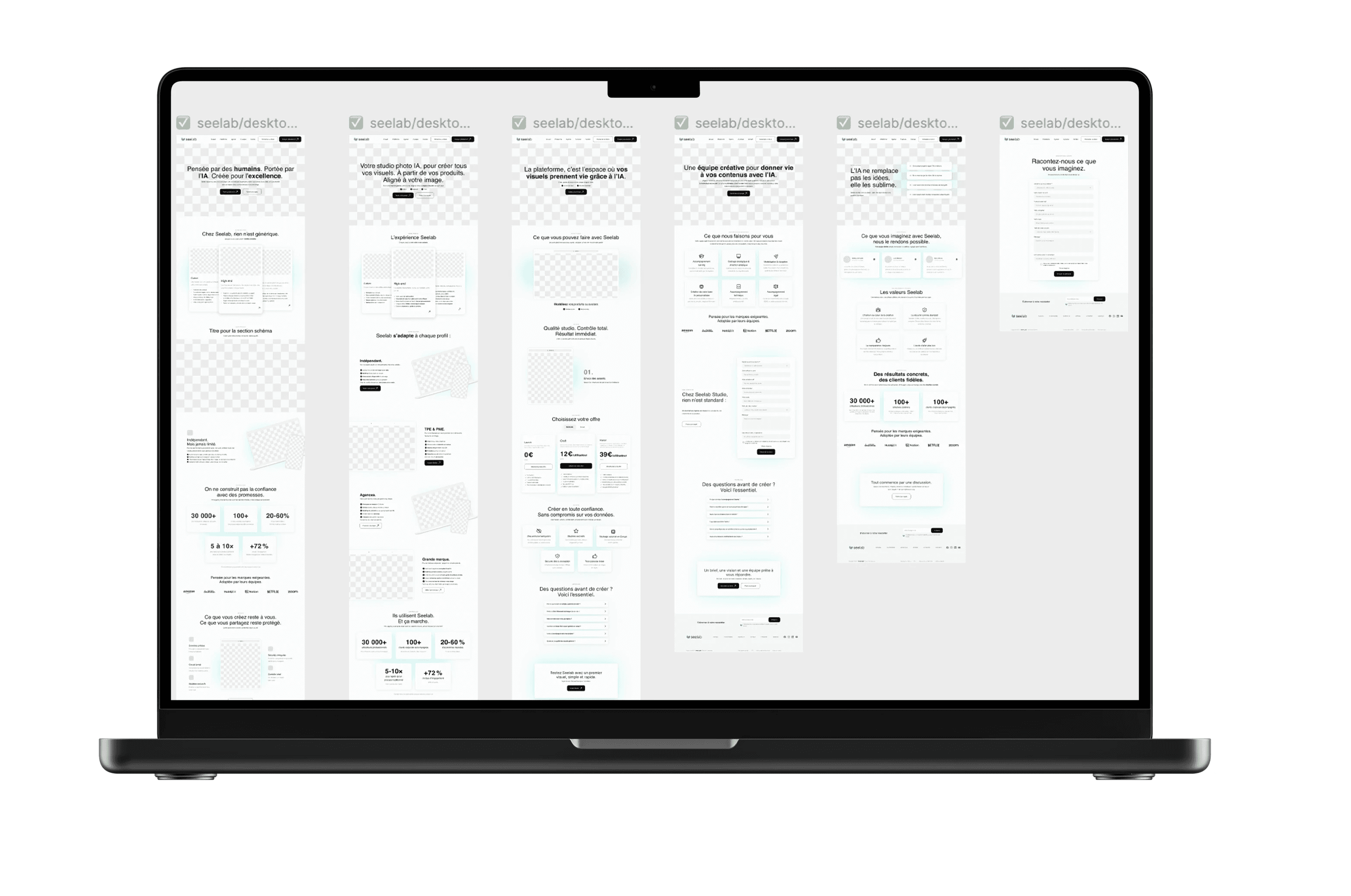 Le site Webflow de Seelab ne reflétait plus son positionnement premium ni la puissance de sa technologie d’IA. J’ai repensé entièrement l’expérience et la direction artistique, du design system au storytelling, pour incarner un univers luxe et innovant. Migration complète vers Framer, optimisation mobile-first et conformité WCAG ont permis d’améliorer performances et accessibilité. J’ai conçu une interface élégante, cohérente et démonstrative, où chaque visuel est généré via leur propre IA. Le résultat est un site à forte valeur perçue, qui soutient désormais la croissance et la crédibilité de la marque.